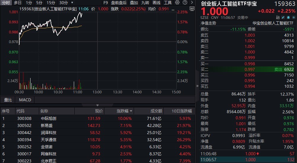 热门ETF方面,全市场首只的创业板人工智能ETF华宝(159363)场内涨幅扩大至2.25%,冲击日线五连阳,实时成交额快速突破8500万元,环比放量明显。