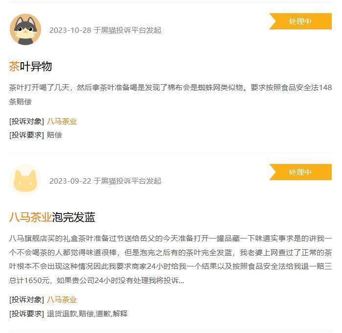 另外,八马茶业还一直被质疑重营销轻研发。招股书显示,报告期内,八马茶业的销售及营销开支在当期总收入中的占比分别为33.93%、32.08%、31.55%,其研发成本的占比均不到1%。而这或许是八马茶叶出现质量投诉的原因之一。黑猫投诉平台上,有多条与八马茶叶相关的投诉,其中部分与质量问题相关,如茶叶质量差、存在线状异物、熟茶中有头发、出现蜘蛛网状的异物、泡完发蓝等。