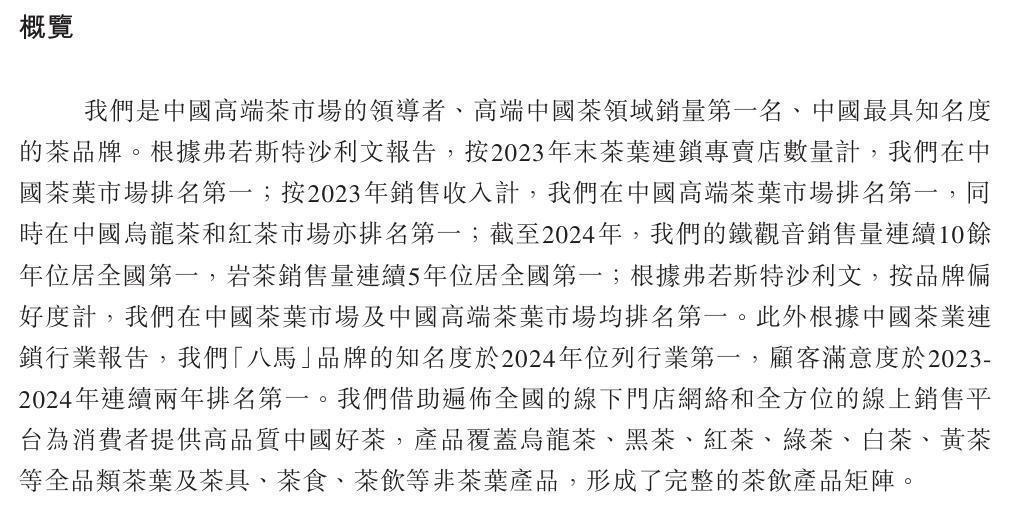 进入茶叶行业多年,八马茶业不仅个别产品销量领先,其在业内也处于领先地位。招股书显示,根据弗若斯特沙利文报告,按2023年销售收入计,八马茶业在中国高端茶叶市场排名第一;按品牌偏好度计,八马茶业在中国茶叶市场及中国高端茶叶市场均排名第一,其在中国高端茶叶市场的份额已经从2019年的1.0%提升至2023年的1.7%。